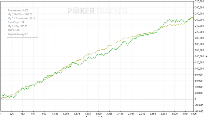 Сегодня откатал чуть меньше, чем обычно играю, 160 туриков вроде вышло. Завтра последний день пула, а по графику и по профиту я на данный момент в лучшем исходе, которые ожидал от этого месяца. По идее, завтра можно еще 200 турниров катнуть, но не хочется как-то смазать итоговый результат, даже не знаю. Бонус я все равно успеваю отбить, даже если я один день пропущу. Там еще будет 7 дней, которых мне хватает с запасом на отмывку. По ощущениям играть завтра надо и нет никаких причин пропускать, поэтому больше склоняюсь к этому и скорее всего докатаю-таки последний день, тем более реги стального феникса мб завтра могут полениться играть и поляна будет с утра получше. С утра и до обеда на 4-ох столах как-минимум 2-3 рега сидит стабильно, за редким исключением, а это всего-то 5-ый лимит. Если играть вечер-ночь, то поля становятся очень и очень сладкие, но не с моим дневным режимом.