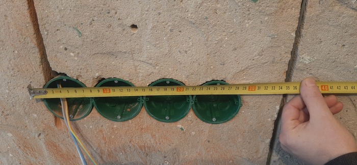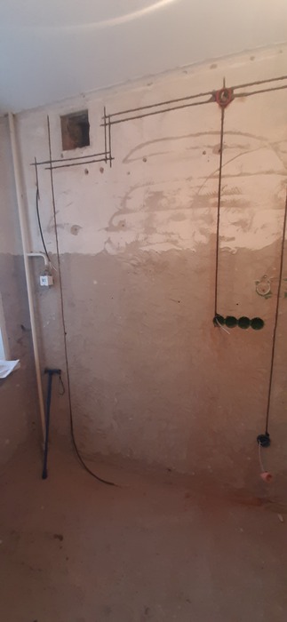 В общем сделали нулевую отметку, настала пора электрики, а как вы помните, у заказчика условие, чистые потолки, то есть свет протаскивать вместо старых проводов, а по розеткам делать новую разводку только по стенам и все коробки распаячные должны быть в доступе, а так как стены у нас еще не сделаны, то у коробок должен быть свободный ход, их не надо намертво вмазывать, в общем это нюансы...