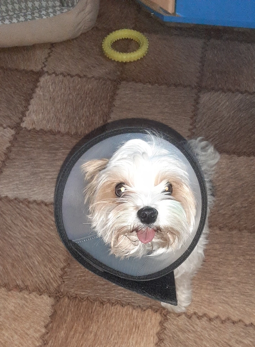 Вечером Айс поел даже, на ночь сняли воротник, и запретили ему врачи кстати на поверхности запрыгивать, а я когда сессия затягивается до утра, сплю в другой комнате вместе с собакеном, так как жене утром рано на работу бывает, там там стоит низкая кровать и рядом с ней лежит плитка для ремонта, то есть по сути сделана ему лесенка чтобы не прыгать, очень удобно получилось.