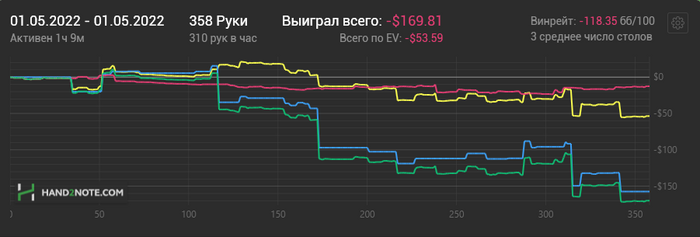 Пока всё так, за последние 5к рук все эмоции прочувствовал) уже скоро 2 месяца пройдет, а у меня дистанции на 1 месяц.Посты графиков и мб раздач буду регулярно выставлять( Всем мира и приятного аппетита! pohuy.