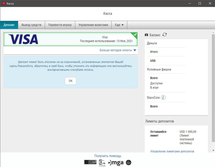 Ваш вывод средств на карту был отклонен в связи с ограничениями на операции с игорными сайтами, со стороны организации, выдавшей карту.