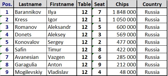 Баранников Илья - чип лидер, его стек составляет 1.848.000 фишек.