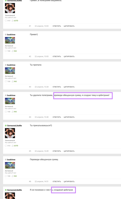 3 человек точно был. Он фигурирует в переписке. Но, если вы предполагаете, что третий человек мог действовать в интересах someonelikeme, то почему не предположить, что третий же человек мог действовать в интересах ТС и арбитраж - это попытка срубить бабла нахаляву? Быстрый перевод по реквизитам в телеграмм добавляет подозрений в этом случае.