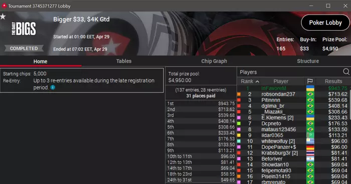 В такой ситуации не растерялся наш бакалавр Максим satred, который уверенно довёл дело до победы, выиграв турнир на 165 входов. За топ-1 Максим получил $943