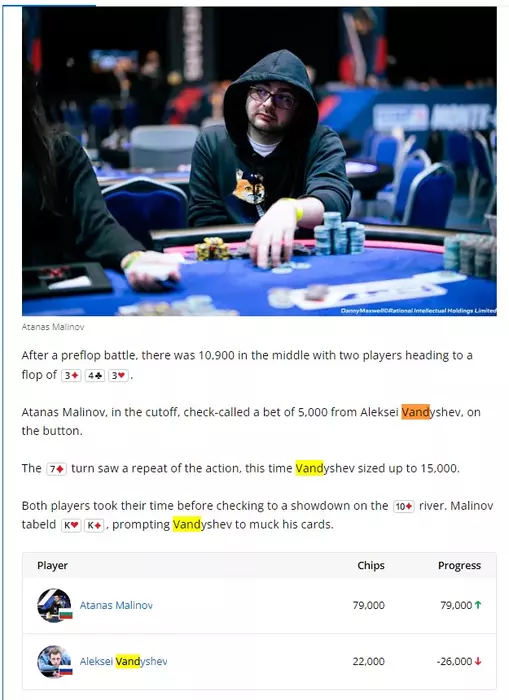 Подробностей о ходе турнира действительно немного. Текстовая трансляция на PokerNews обновлялась не так частно. Мы знаем, что в самом начале турнира Алексей проиграл больше половины стартового стека Атанасу Малинову . Осталось 22.000, но это лишь раззадорило одного из основателей ФиатЛаб