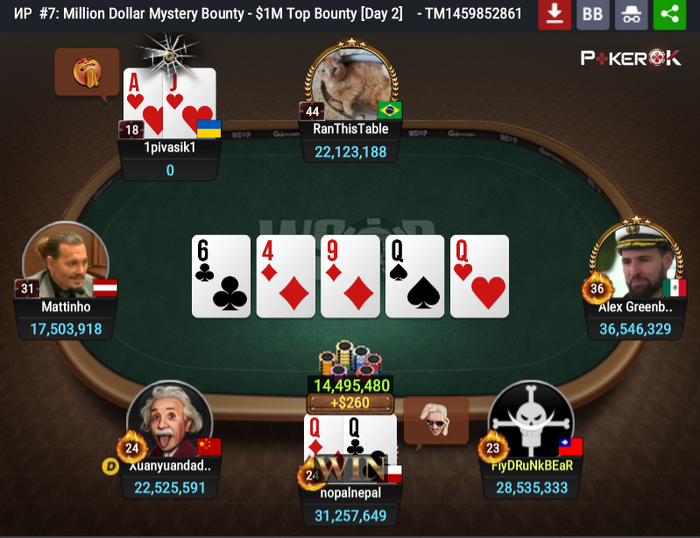 Nopalnepal сначала переехал дам Mattinho с рукой KQ, а потом всем наглядно показал, как нужно правильно обращаться с дамами, оставив 1pivasik1 на 50-м месте: