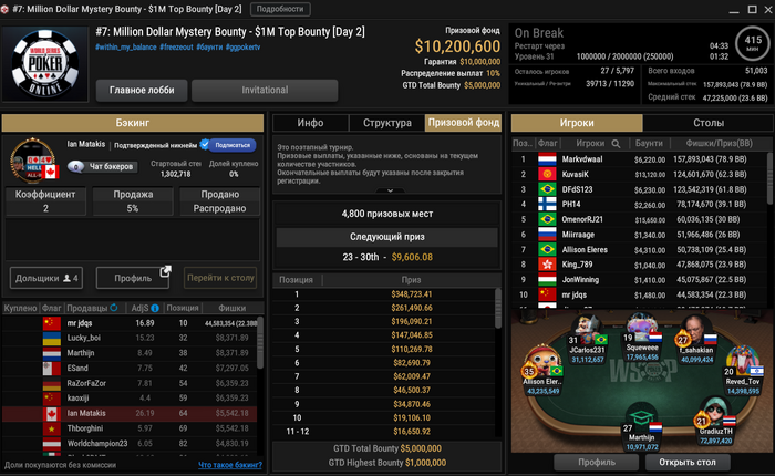 Lucky_boi защитил большой блайнд, сыграв чек-пуш флопа с топ-парой, но у Miirraage была ТПТК. Ростислав занял 32-е место ($8371 + $1630).