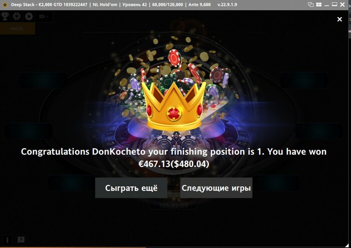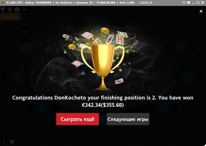По вчерашней сессии: полностью исключил турниры за 10 долларов. Подожду маленько (чтоб бр подрос), хотя может один буду подключать. На Кинге почти получилось дойти до предфиналки, но адский переезд на ривере и гг.