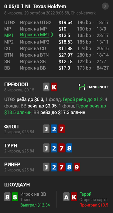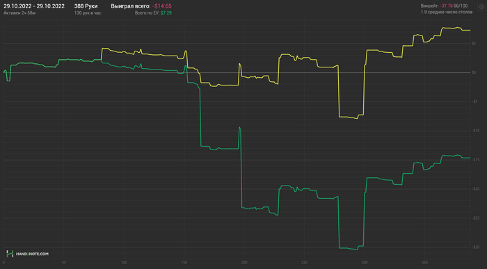 Я понял, что, возможно, это моя ошибка, что люди читающие эти раздачи видят только впип и пфр, так что уточню про этого фиша: фолд на 3бет 0 раз из 8, донк=71, агрессия 62/60/68 и все в таком духе, вечно очень глупо блефовал. Результат пока не радует, дальше будет лучше.