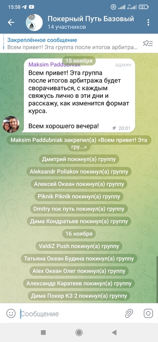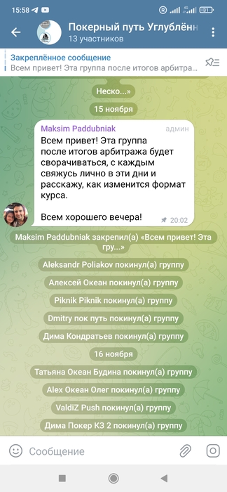 Далее,человек продолжает воровать общую собственность и действовать за спиной.Авторский курс,который часть проекта и результат наших совместных действий : в группах по нему ( состоят ученики и продолжается постоянное развитие после окончания обучения) он начал описывать каждого и менять заявленный формат,понятное дело,не спросив и не известив меня об этом.( Скрин прилагаю)