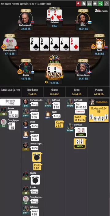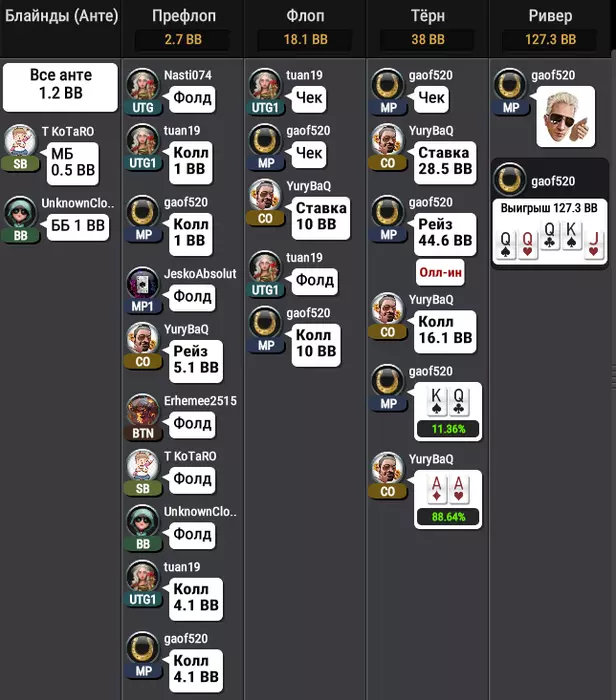 Недавно пришлось наблюдать интересную раздачу. Как же жалко русского игрока. И насколько фартовый китаец. Ладно кол сквиза с КQo, но кол более пол банка по флопу с его рукой. Вроде как очень плохая игра, но доехал же. Проиграть банк в 10 стартовых стеков и нок почти в бай-ин с АА с 90% по терну. Понятно, что нам такие фиши нужны. Но когда дистанция собирается возвращать, хз...