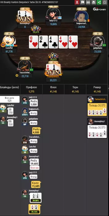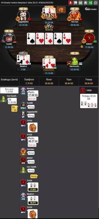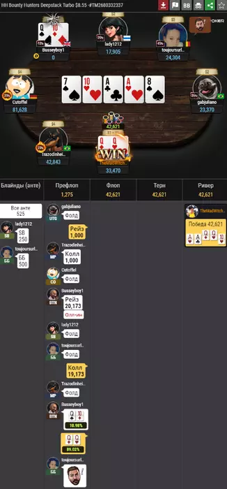 3 рука в турнире. Только начали. Я открылся с двумя леди. Трибет с катоффа мне нравится (хотя сайз можно побольше использовать как по мне), а вот далее бред. Понимаю, что турнир за 2,5 доллара, но пуш J7o против рейза с утг и 3 бета с мп точно ужасный, а кол с мп с JTs точно не лучше. Не знаю даже, что хуже. Понимаю, что должен радоваться, что утроился на ровном месте. Хз. Вроде таких раздач хватает. Но почему-то чего-то не хватает что ли (простите за тавтологию). Дальних проходок, наверное. И удачных обстоятельств в игре в поздних стадиях. А может, я переоцениваю свою игру и понимание покера. Хз. Посмотрим, что будет дальше.