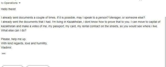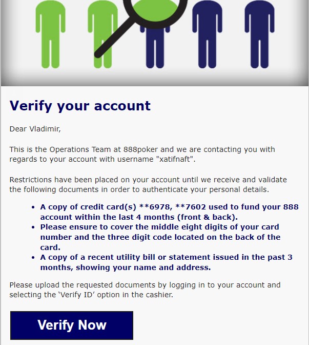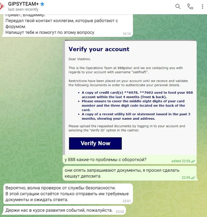 Уже аж 3 месяца 888-ки взяли мои денюжки и не подтверждают мой аккаунт, уже что я только не отправлял, документы, карты, мои фото, они снова и снова запрашивают документы. Неделю назад я написал им, что раз меня не хотят пускать, то я прошу вернуть бабки и предлагаю пожать руки и попрощаться. Написал в джипси, они пообещали подключиться к вопросу через менеджера. Сегодня от 888-ок приходит ответ.