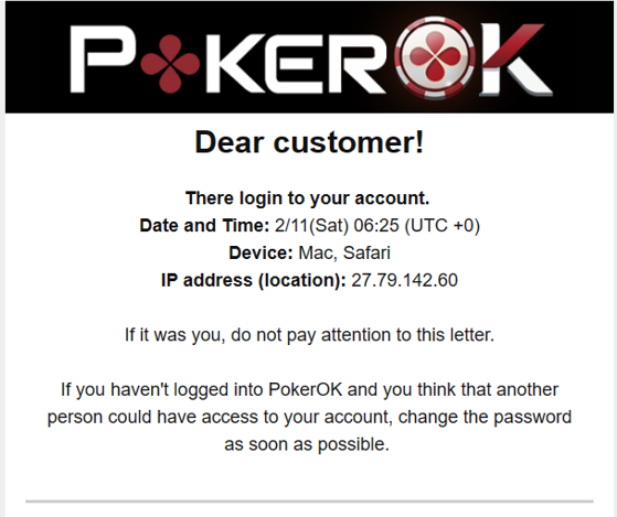 Подтверждаем, что 15.02.2023 в аккаунт был выполнен вход с IP адреса, который ранее не использовался для входа в систему. Это стало возможно благодаря смене пароля, что свидетельствует о взломе адреса электронной почты, который закреплён за игровым аккаунтом ПокерОК или же о передаче персональных данных мошенникам. К сожалению, нам не удалось вернуть средства на игровой аккаунт, так как они проиграны в разделе "Казино".
