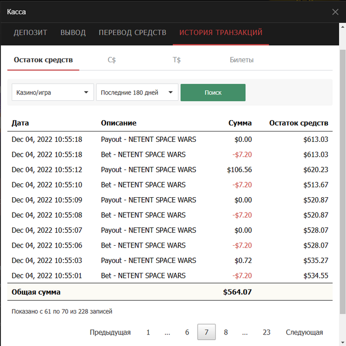И таких входов было много, точно не считал, может штук 100 за пол года. По-скольку маком и сафари я не пользуюсь, то я понял что кто-то имеет доступ на мой аккаунт, и был удивлен что деньги мои ни разу не пропадали, я подумал зачем он тогда заходить на мой аккаунт если не трогает деньги? и нашел в истории кое-что еще, а именно тогда, когда на моем аккаунте были деньги, кто-то играл на них в казино, сам я не играл в казино ни разу, но в истории вот такая статистика