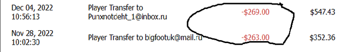 В моем случае получается так, он заходил в казино, посматривал есть ли у меня деньги на счету, если они были то он играл на них в казино, два раза он выиграл около 250$, перевел их себе, а мои деньги ( 547$ на тот момент) оставил на месте .О его логики можно только гадать, видимо было так, он хотел остаться не замеченным, если бы он проиграл , то переводить деньги себе не понадобилось бы, и его почту никто не увидел бы, а если выиграл, то банкролл тот же у человека, а смотреть в история он наврятле будет... По итогу хочу сказать, администрация пишет что они ни возвращают деньги когда есть возможность, получается они должны забрать 532$ у этих мошенников и вернуть мне ? они ведь были выиграны на моём аккаунте, и риску подвергался мой банкролл)) Тем более вон есть адреса этих мошеников), ( шутка, понимаю что ничего не дадут, я то в принципе доволен что хоть мои не проиграли)