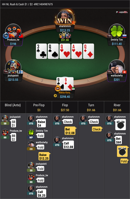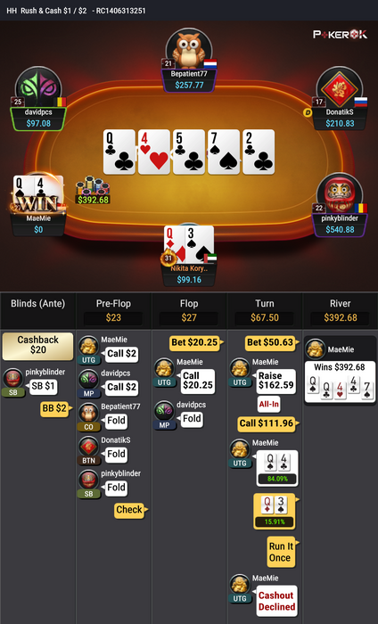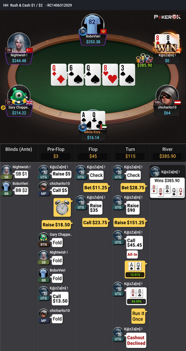 И кулер в бум поте. Мог наверное отскочить, но бум поты сложно играть по другому. Тем более, от двух пар ожидал рейс на флопе, так как лежало флеш дро + были ауты на стрит.