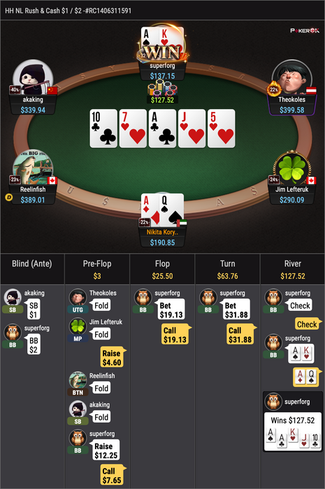 Оля ин не ставил, чтобы добрать и с JJ и QQ. В АА, KK естественно надо было пихать, но кто ж знал. Он вколил 2х овербет на терне и 1,5x на ривере. Уже хорошо!