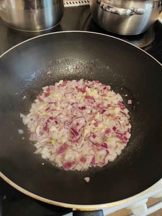 1) нарезаем одну красную небольшую луковицу, можно большую если любите много лука. Выбирайте для себя как. Круто полукольцацами, я выбрал кубиками , т.к малая не очень любит явно лук на вид, но на вкус любит.2 зубчика чеснока раздавливаем и мелко шинкуем к луку.