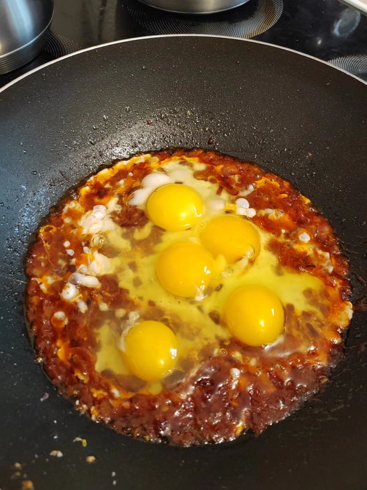4) обжариваем все минуту и вбиваем яйца. У меня 5 штук на 2 толстых кесадильи. Перемешиваем и жарим до состояния скрембла. Выкладываем на тарелку.