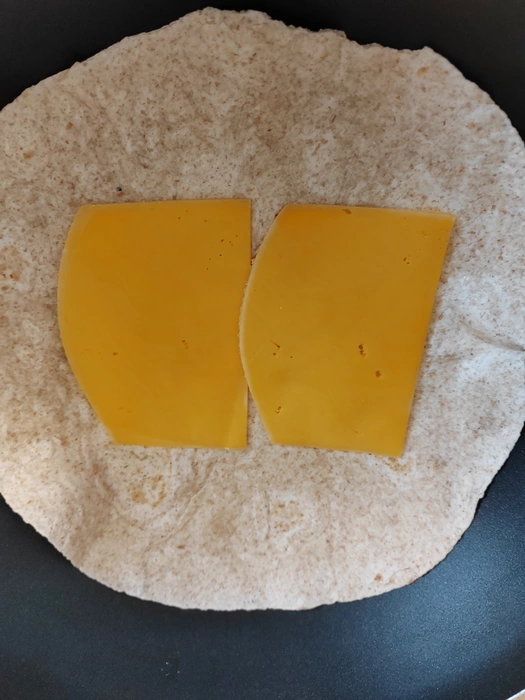 5) разогреваем чистую сковородку, добавляем немного растительного, выкладываем тортилью любой марки но лучше поплотнее. На тортилью две пластинки сыра чеддер. У меня белорусский, или любого другого( российский, лёгкий). Лучше нарезать пластинками.