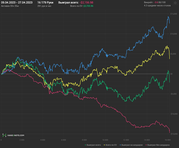 Сразу после своего последнего красивого графика я взял два дня отдыха от игры и вернулся в игру другим человеком. Я потерял те лёгкость и скорость принятия решений, которые ощутил в предыдущие дни и, казалось бы, поймал омаху за хвост и уже никуда не отпущу. Я ощущал себя будто оглушённым огромной резиновой булавой; состояние сознания было похоже на алкогольное опьянение, когда полуонемевший мозг с отключенными защитными механизмами буровит что-то несвязное. Я отказывался принимать происходящее, открывал новую сессию, отыгрывал запланированные полтора часа, делал небольшой перерыв, разбирал проигранные и отмеченные руки, и снова по кругу. И опять моя игра местами представляла собой скорее инстинктивные возбуждения нейронных синапсов, чем то, что принято называть солид покером. В таком темпе я отыграл тысяч 5 рук, слава б-гу не так много. В один день я просто проснулся и ощутил, что готов выкинуть из башки всё ненужное и делать то, что должен.