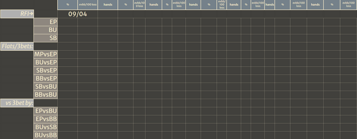 Нарисовал такую табличку для трекинга резалтов в пло трейнере. На данный момент такой трекер есть в omahapro, но там нет 5 карт и мне не нравится интерфейс. Тут можно выбрать для себя самые важные споты и их отрабатывать. Я для начала взял те, что выделены более светлым и на которых написано #DIV/0!. Ниже слева можно добавить строчки с другими спотами, например, 4беты. Вся проблема этой залупы - в сборе информации. Сначала я сделал табличку, в которую можно записывать резалт каждой треньки, но она, конечно, в крайней степени неудобна по понятным причинам: