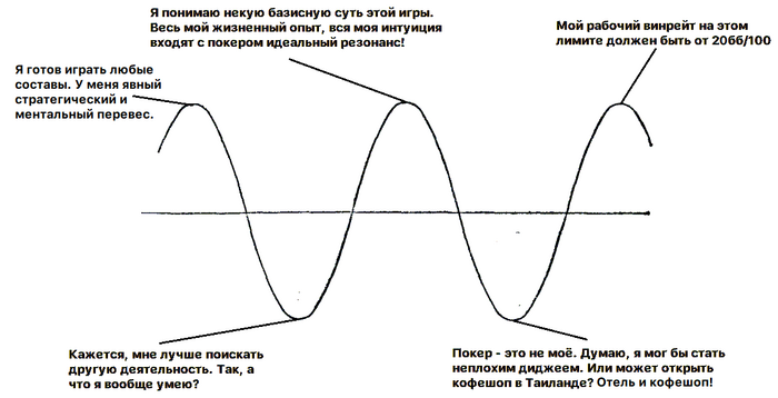 2. Мой мозг сейчас одержим идеей быстрого заработка, лёгкого пути. Сознательной частью своего разума я гоню от себя эти мысли куда подальше, однако моменты, когда я попадаю за столы с убервипами типа 95/90/50 и винрейтом -300бб/100, работают как лакмусовые бумажки моей истинной мотивации. Почти каждая такая сессия кончалась тилтом . Работа над этим багом сознания станет большим для меня шагом.