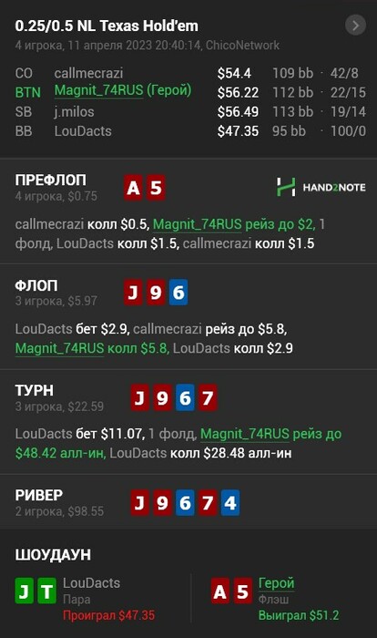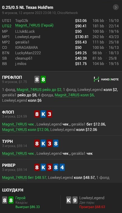 Интересная сегодня катка палучилась. Стартанул сессию в 23:00 по местному времени. План был плотно покатать до 04:00 утра, посмотреть немного NHL и лечь спать. На Poker King было всего пару столов, и те НЛ25. На Чико постепенно собирались столики НЛ50. При чем столики очень хорошие! Но была одна проблема, я просто не мог попасть в доску против слабых оппонентов. В итоге за 5 часов катки, скрафтил сет шестерок и проиграл бэкдорному стриту.🙈 Время подходит к 04 утра, а я понимаю, что не могу встать с таких столов пока не выиграю хоть что-то)) В итоге все таки забрал хороший банк и довольный закрыл клиент.