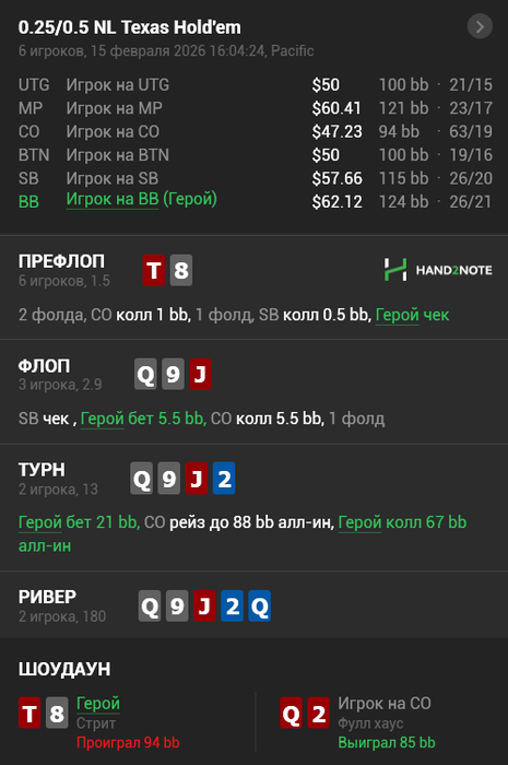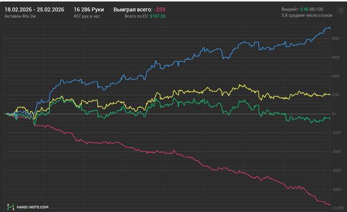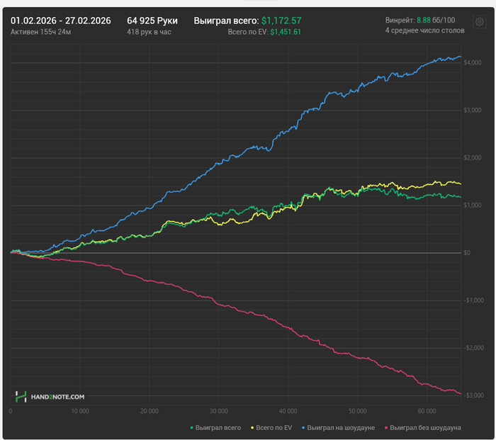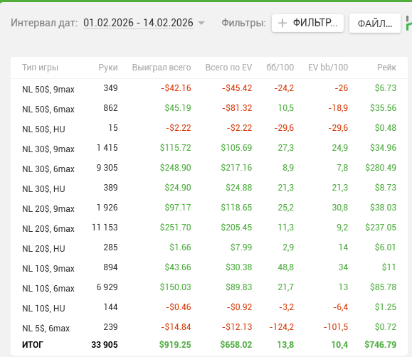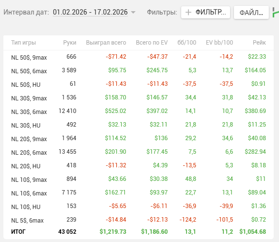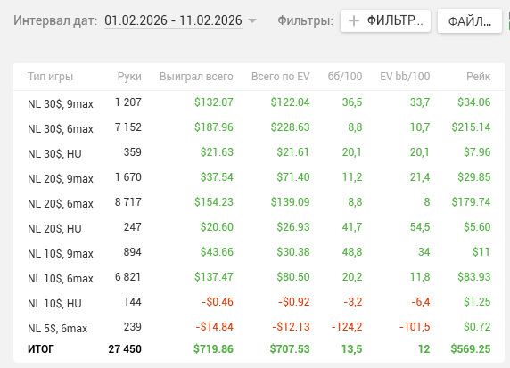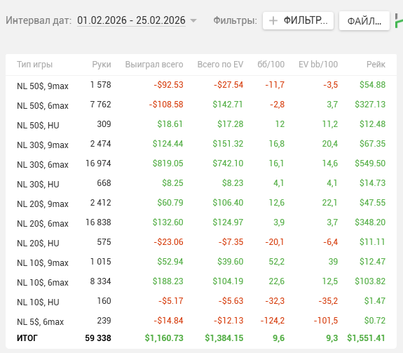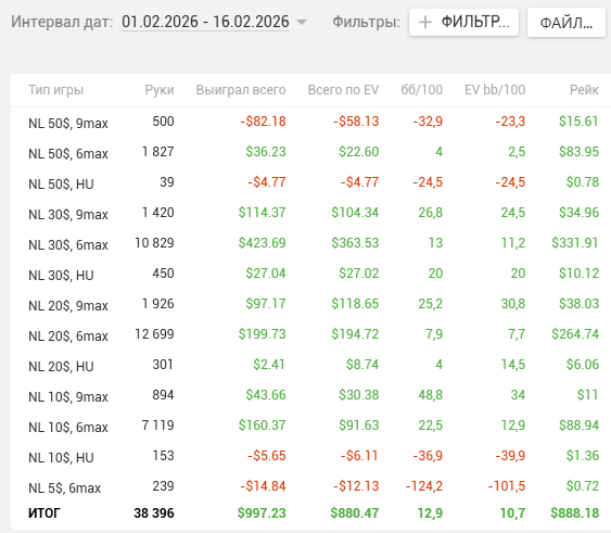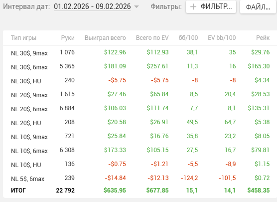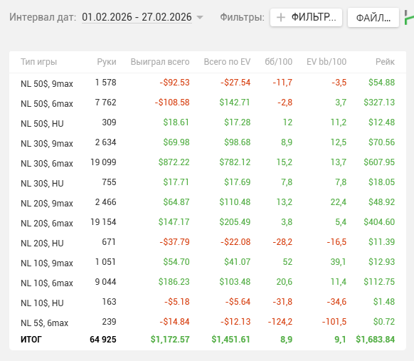 Ниже даю рез за февраль. Общий профит составил +$1 305, существенную часть БРа я кэшаутнул и сейчас на балансе $330, и из этого следует, что следующий месяц снова пройдёт под эгидой лозунга "катка на выживание" 😁 А пока попытаюсь отдохнуть от покера, ведь нулевое месиво последней недели забрало много ментальных сил (сходим с женой на концерт и посмотрим после этого бокс ночью).
