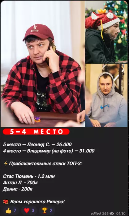 В 04:00 нас осталось трое. Делить со мной не хотели, ибо я короткий. Через 15 минут подсушил чипака тысяч на двести и забрал 2/3 стэка у спортсмена идущего на втором месте, и коротким стал он. Выплаты были вот такими.