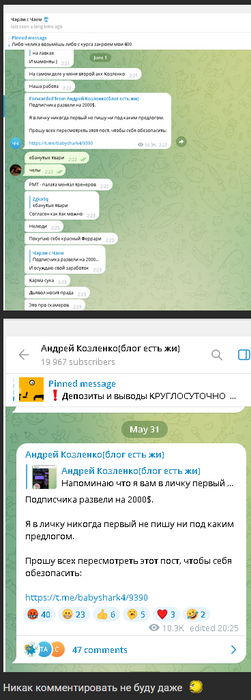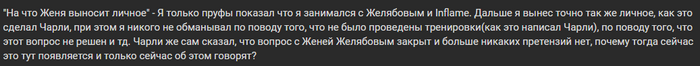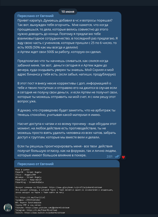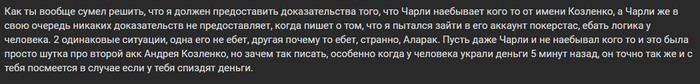 Он вынес на общее то, что доказывает твою вину перед командой, перед покерным комьюнити и что в целом подверждает, что ты виноват во всех своих арбитражах! А ты выложил скрины с Инфлеймом и Желябовым и вашей личной перепиской с Чарли, по которой прекрасно понятно, что тебе парировать, кроме как вытаскивать старые какие то моменты из личного общения - нечем. Ты пытаешься догнать какие то бабки очерняя руководителя команды и роняя честь команды. Кто ты вообще такой, что бы считать себя сооснователем команды и первым лицом? На каких правах ты себе присудил это звание? Мне кажется, что в столь юном возрасте, тебе корона перекрывает кислород к голове, и ты несешь чушь. Советую сходить к педиатру. Да-да, именно к педиатру.