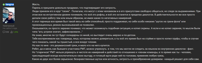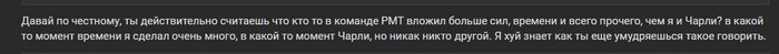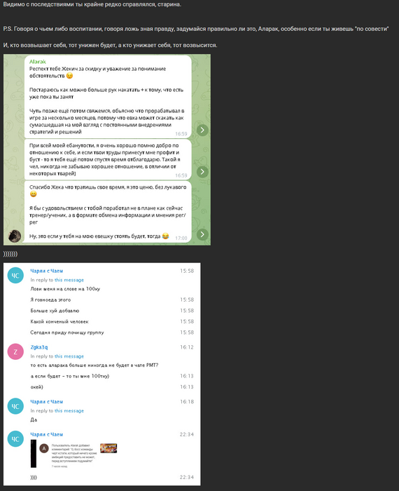 Могу дать информацию по духу, который царит в РМТ. В этом проекте общение построено свободно, есть куча локальных приколюх, которые со стороны выглядят тупо или грубовато, но это пишется не для того чтобы кого-то обидеть или задеть. Это локальные мемы и междусобойчики. Какое отношение они имеют к тому что человек, который ранее уже спалился на мошенничестве, втёрся в доверие к руководству РМТ и начал заниматься мошенничество уже внутри РМТ - решительно непонятно. Особый шик - выкладывать фрагменты личной переписки, вырванные из контекста. Полагаю когда мошенник оказывается в новой тусовке, он первым делом начинает собирать компромат на окружающих, чтобы в случае возникновения конфликтной ситуации (а конликты будут если обманывать людей) можно было хоть что-то сказать в свою защиту, когда по факту сказать нечего. Человек подозреваемый в мошенничестве поступил именно так. Он решил очернить проект "основателем" которого якобы был, что лишний раз подчёркивает, какое отношение он на самом деле имеет к проекту РМТ.