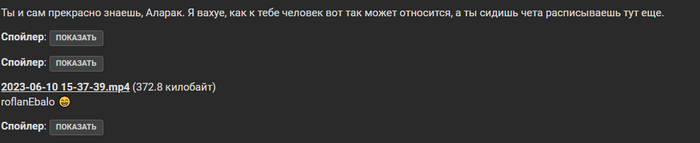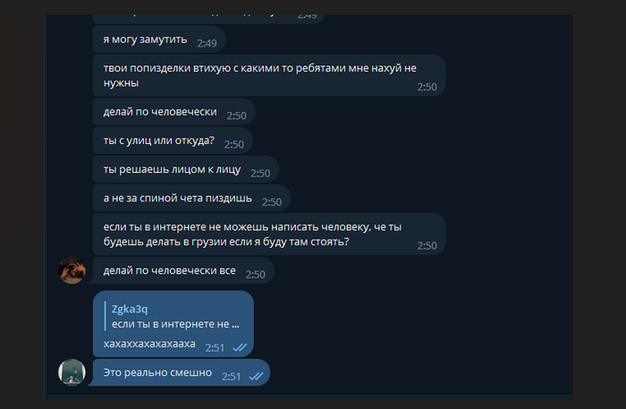 Тебя, извини меня не должно вообще е*ать как мы общаемся. Я конечно очень рад тому, что ты решил на фоне этого всего вступиться за меня, но ты знаешь Жень, это лишнее, хотя бы просто потому, что личные отношения других людей не должны касаться кого либо, потому что это ЛИЧНОЕ! Ты даже сейчас взял и нашел переписку наверное годовой давности и выложил сюда. И да, учитывая что тогда у меня была такая аватарка в телеге, это означает, что ты скринил это заблаговременно, то есть ожидал что тебе понадобятся эти скрины в будущем. Странно, что информации на этих скринах ноль, какой то более менее адекватной, а вот то что ты выносишь личное снова на поверхность - факт налицо. Это еще раз подтверждает факт того, что аргументов у тебя х*й целых, ноль десятых.