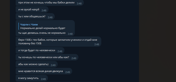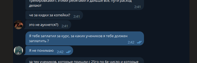Нашёл одну из угроз, ребята заплатили в общем 700$ а твоя сумма 1900$ взята из твоей жадной головы< c тобой работали сдельно, тебе платили за индивидаульные тренировки, по факту их проведения, и никто не считал тебя полноценным руководителем, ведь твои поступки начали всплывать на ружу.