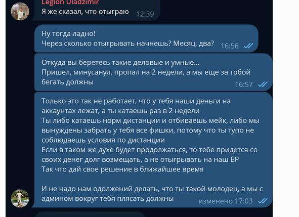 2xgomelx @ 22.09.23Дизель, именно так и случилось. Я пытался отыграться по началу но приложения весьма специфичная вещь, я играл сколько мог, но отыгрыш пошёл хоть и минимальный по 10-15 долллр, затем меня начали задалбывать этой дистанцией, я решил , что просто сяду на лимитик по выше выиграю один олинн и досвидания, однако не получилось и я залил все аки, хотя также на скрине видно, что я просил пополнить ЛИШЬ ОДИН АКК, не 3 и не 4. В итоге даже без спроса он обвинили в краже денег. Мне стало просто похрен на этого чела и я вышел, ибо он просто мне выносил мозг своими сообщения о дистанции.