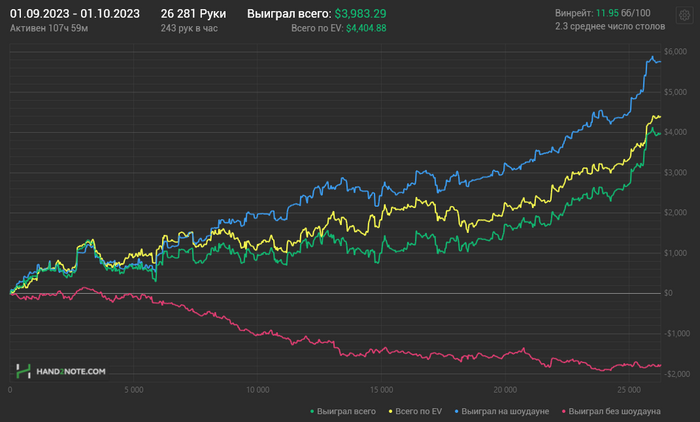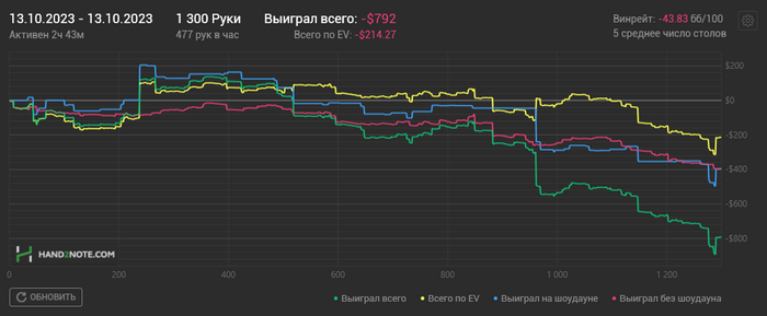 После сел катать, но чет энергии нет вообще. Еле отсидел 1,5-2 часа. Что-то плюсанул, и при оставшемся 1 столе закрыл... Вчера откатал через силу. Но сегодня и так уже на волевых даже чуть больше полтора часа отыграл. Поэтому дистанцию и почасовку в этом месяце даже не знаю какую покажу. Но насиловать себя ради отыгрыша вообще не хочется... Покер это же свобода?)