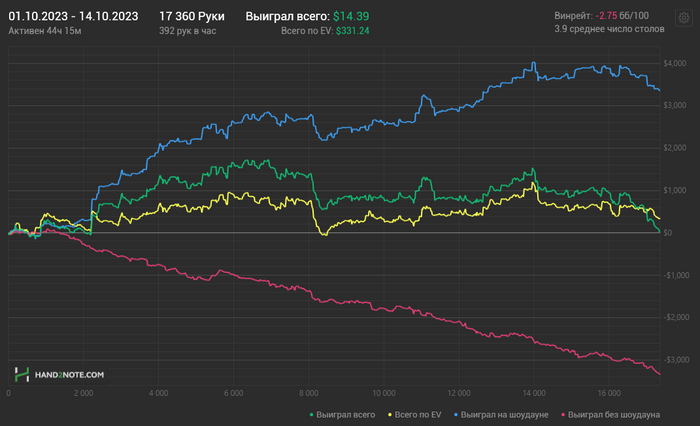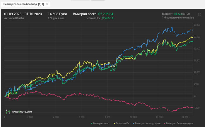 Красная аллтайм падает. Но не с такой скоростью. А если страту не так сильно меняешь, то краткосрочно все дело в качестве бордов. Например у меня была раздача с 99 мой ББ вс МП на доске 963 радугой. Флоп чек/рейз. Терн 5 фд поехало, ривер 7 закрывается флеш бэкдорный. И тайтовый чел ставит мне Олл-Ин. Спасибо) Ну и подобных сценариев достаточно в этом месяце. От этого и угол наклона красной страдает. Я не списываю полностью на диспу, сам чувствую усталость. Но как один из факторов - это все же плохие ранауты.