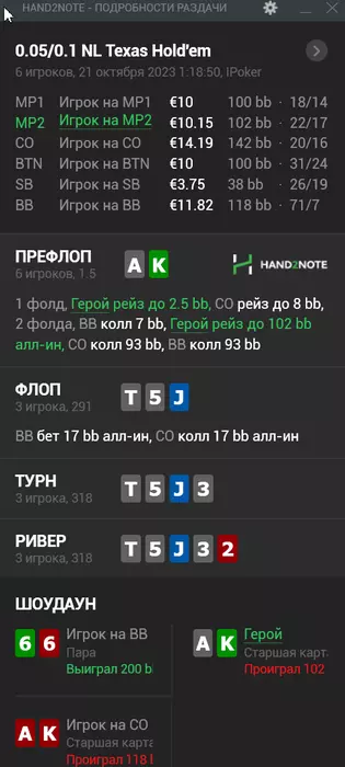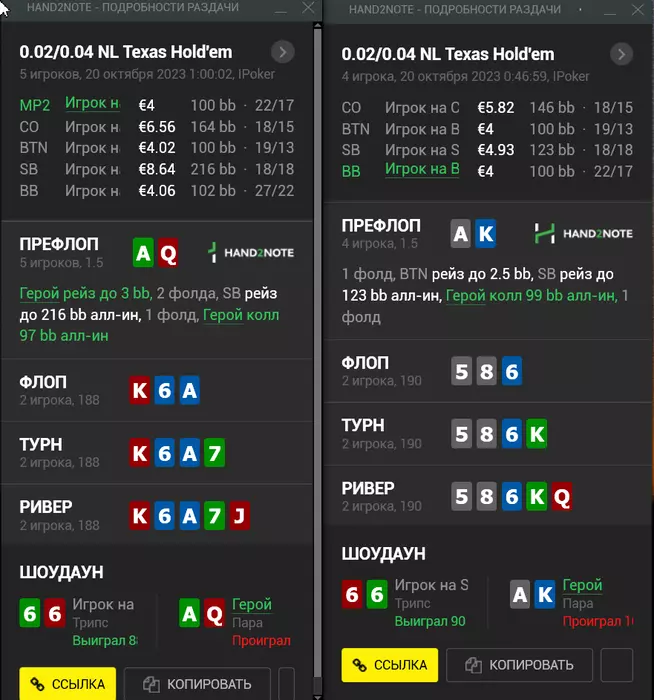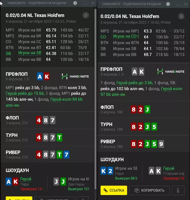 Вот эти две раздачи с одним и тем же фишом,который просто начал запихивать префлоп 100бб каждую вторую раздачу,я подобрал для колла приличные руки,но получилось неудачно,наверное с АК то я точно не ошибся,с AQ можно было и не рисковать: