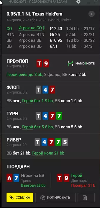 Я не особо шарю, сразу скажу, можно особо не прислушиваться, но мне нравятся овербеты терна периодически бахать, с пониманием или без (пока микросы катаю все равно), но в любом случае рука максимум на две ставки, флоп ок, терн можно 75-150%, ривер чек. Добираешь с дров по терну, проблема тут скорее в том, что твоя девятка основную часть ему блочит, но по спарке тут и многие покеты младше хер кто выкинет, судя по тому, что я у себя в спотах видел. Донк ривера разумеется чистый пас, даже не думал бы. Я в таких спотах буду оверфолдить + я и сам дончу доезды ривера на своих лимитах, потому что наше поле чаще супертелифонистое и суперпассивное, по моему доезду я чаще буду видеть чек, потому что такое поле, при этом донком чаще доберу, челы не любят фолдить красивую и телефонят. Как видишь, чел не стал рейзить 7x на терне, они тупо пассивы все.