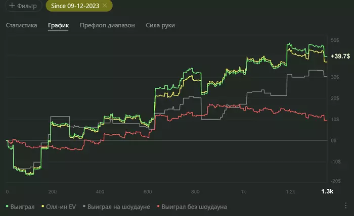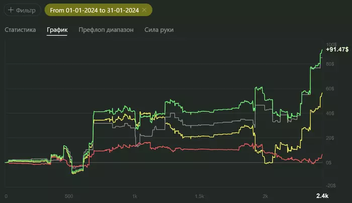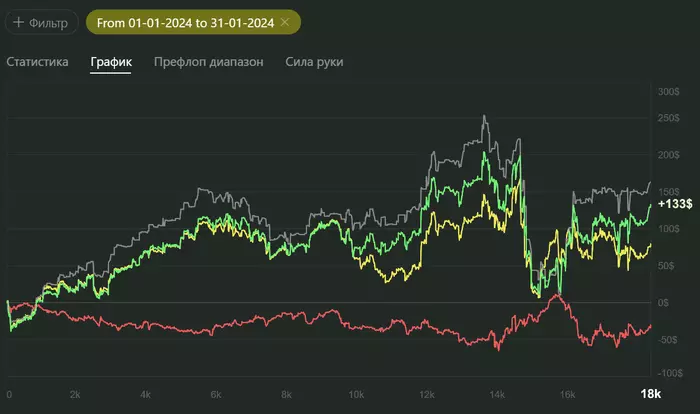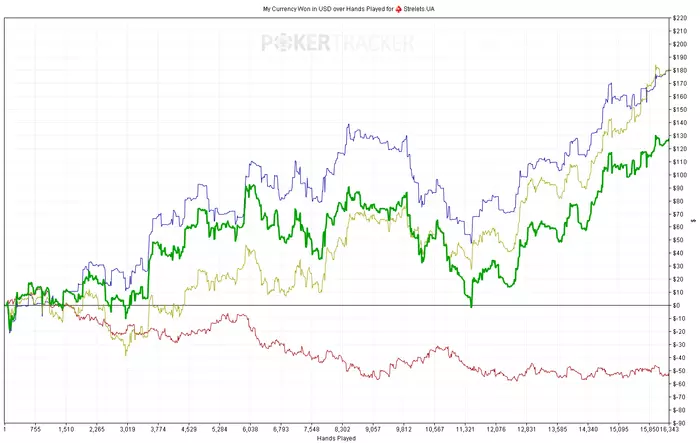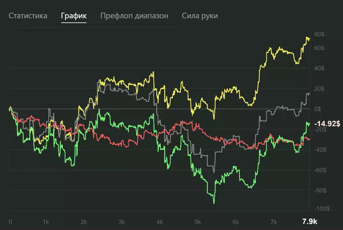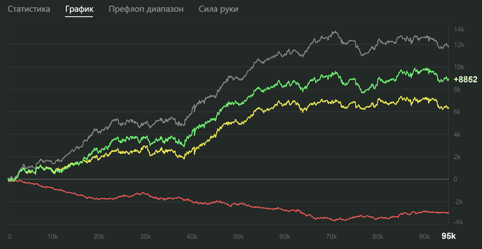 В итоге за месяц я отыграл чуть больше 16к раздач с винрейтом 7,8bb/100. Результат на графике: