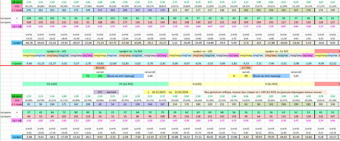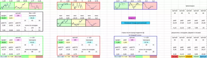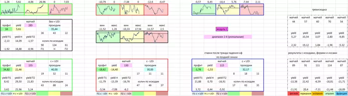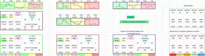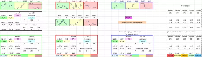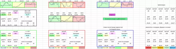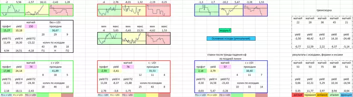 В зеленой рамке результаты и графики при совпадении моего отбора матчей по ретроанализу и роста UDI ( или нулевого UDI >=0) с падением кф . В черной - без привязки к UDI, те результаты что есть по этой таблице. В красной - с привязкой к минусовому UDI. В синей - с привязкой к плюсовому UDI ориентуруясь на тренд падения от линии открытия до поздней линии (момента ставки), то есть по просаженным кф.