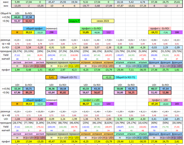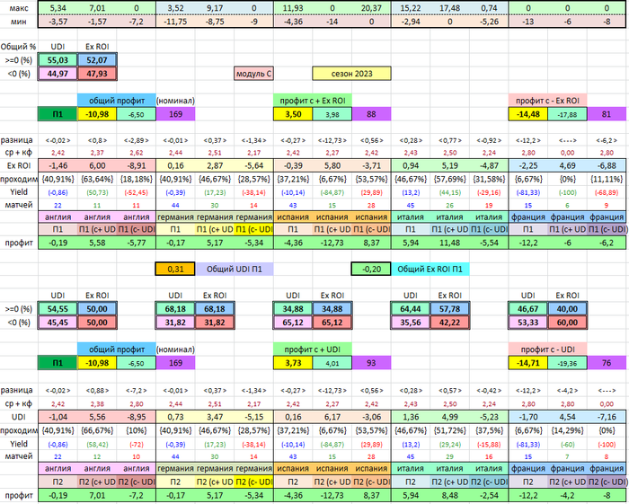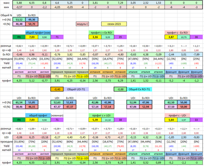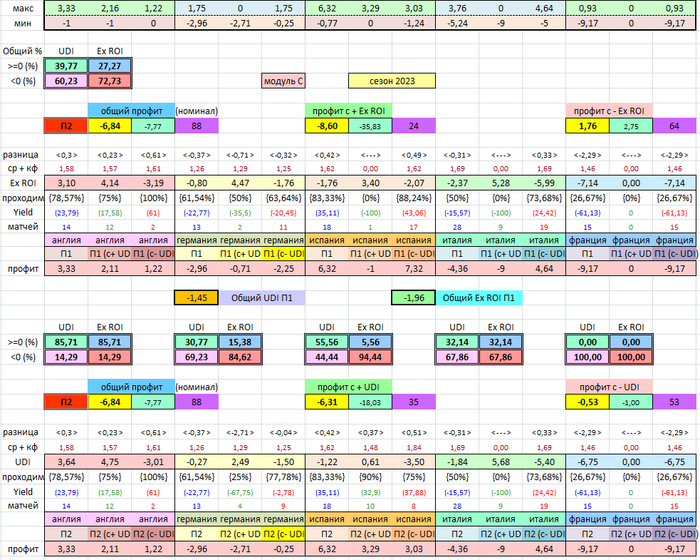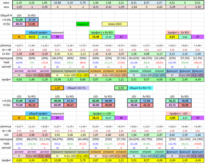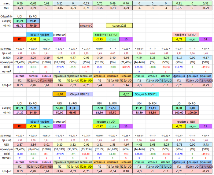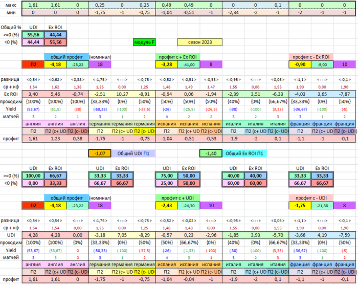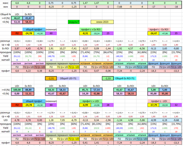 Забыл отметить, что приведенная основная статистика по исходам с UDI и Ex ROI показана по линии поздняя-закрытие, так же забыл отметить, что исходы велись в этих таблицах с индивидуальными диапазонами, особенно П2 с кф. от 1 до 2 (поэтому профит если и совпадал с + UDI по странам, и имел высокую проходимость, то имел маленький + кф и накапливал ничтожный профит).