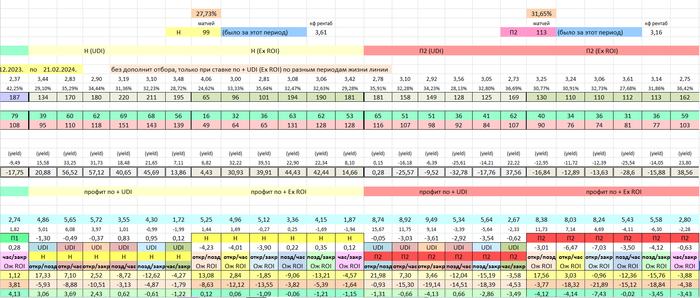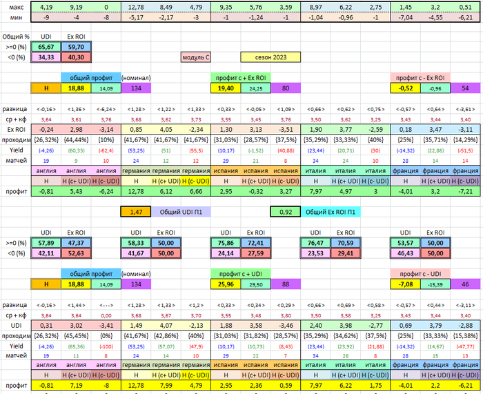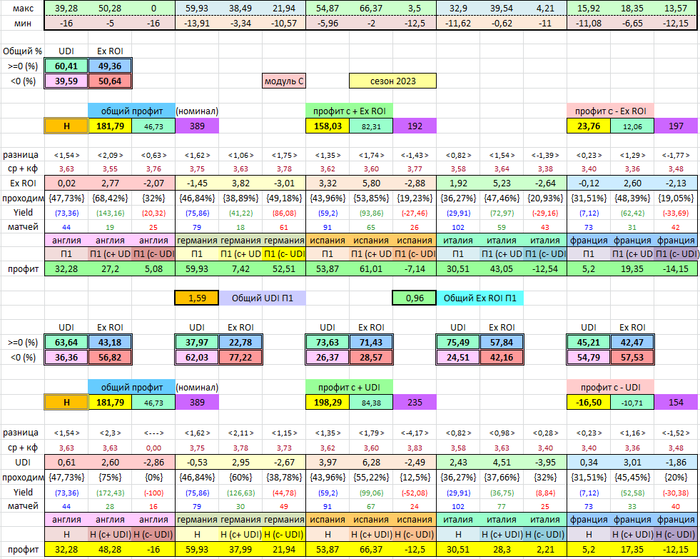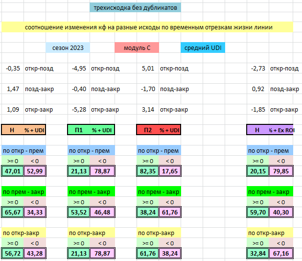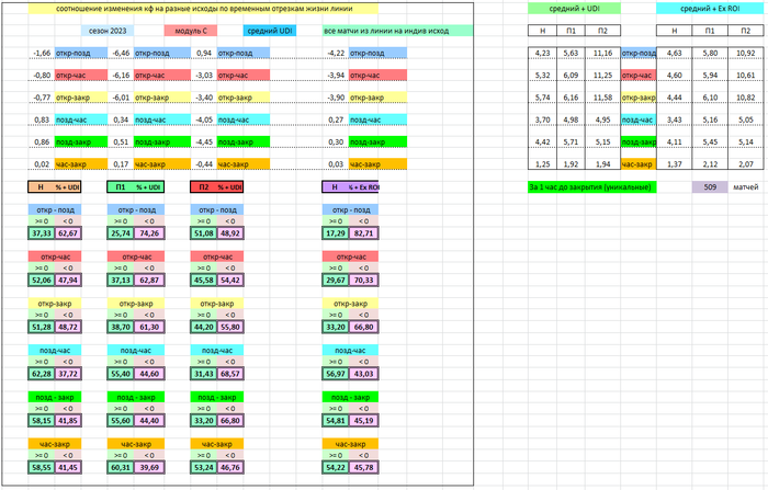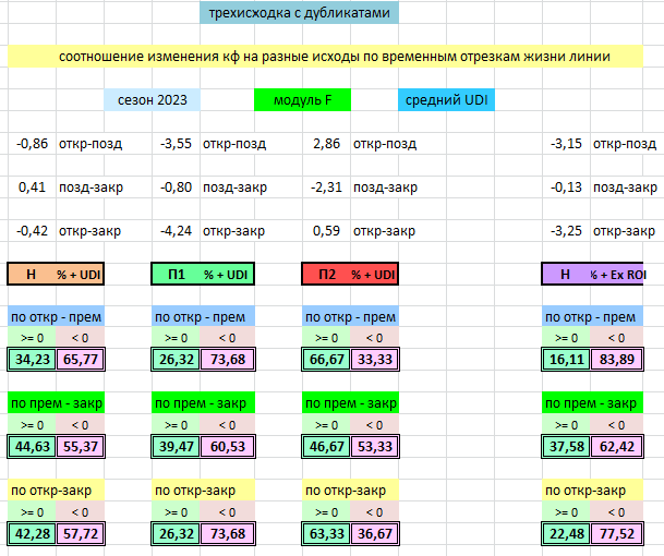 Немного статистики по UDI и ожидаемому ROI на разных исходах сезона 2023 + рост и падение кф, и их соотношение, по разным исходам на временных отрезках жизни линии. Пока только по модулю С.
