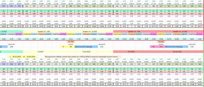 Подсчитал статистику и возможные результаты игрока, со ставками зеркально отображающими тренд падения в разные периоды жизни линии. То есть речь идет о ставках исключительно по + UDI и Ex ROI, без дополнительного отбора, или с доп отбором, который не влиял бы на уход в сторону (по сути что он есть, что его нет - нет никакой разницы).