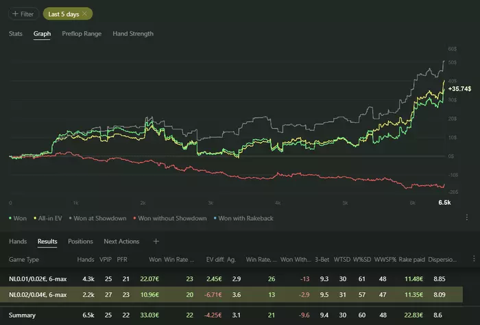 Наступил UPSWING и по ев и по факту, что порадовало, однако играть НЛ10 довольно бессмысленно, как я вижу, ибо рейк на нл10 11.8evbb/100, а на нл20 8.5evbb/100 и голд статус на нл20 набивать полегче.