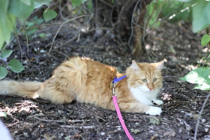 Рыжий сначала "стеснялся", однако в настоящее время избавляет участок от грызунов и поводок ему безнадобности