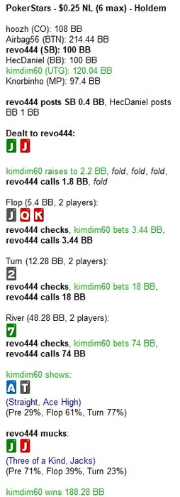 В середине сессия шла кайфовая, пока за столом не оказался чел с 1000бб в годмоде, выиграл у него 1 стек, вьебал 3. В банк 6бб лидит по 27-45, веселая игра. Когда такой уходит из за стола даже пропадает желание играть, хочется именно его выебать.