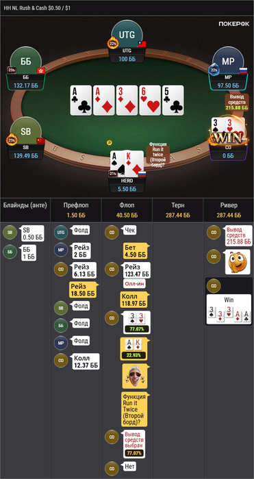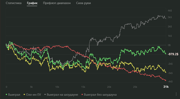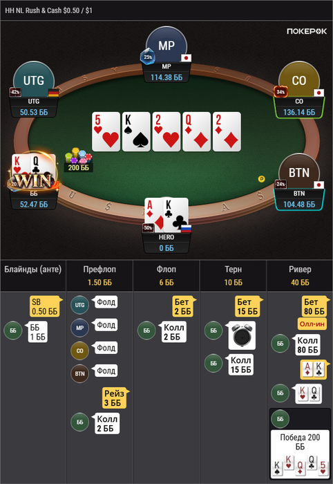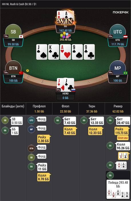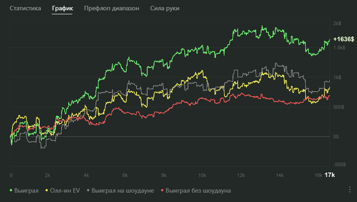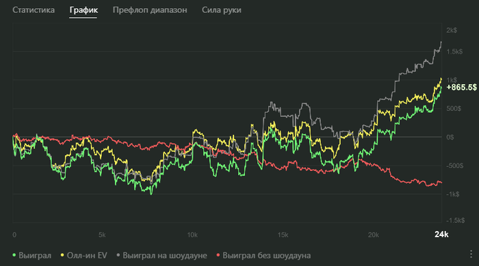 Как видите, ни одной премиум руки типа АА, КК. Короче, наглядное пособие почему в дип стейках ценность спекулятивных карт повышается.