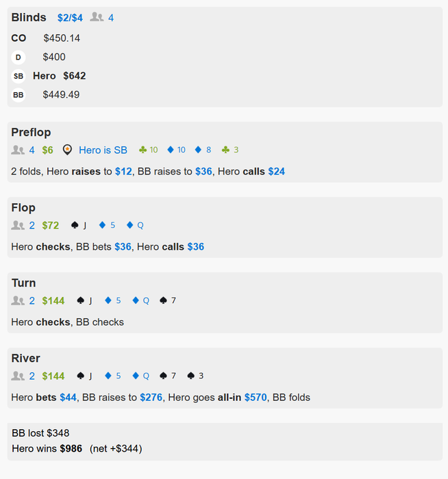 Rosiom, Типо чел если не балансит чеком натс ФД по терну , сильно капнулся на натсфлеши и без блокерах запихали ... Ну это в эксплоит против тех у кого через чер большой 2ой бет по терну. в 4 карты опыта нет , но смысл понял . А вот треть по терну без Фд блокера нравится ? По идее у нас не особо карты ТТ в руке и буби , блочим то что по сути хотим выбить , хотя на треть нам не часто нужно выигрывать . Самое интересное это какое колво не натс флешей у него тут в 4 карты а такой линии есть. Обычно не мало так, это мы целимся выбить ТП- оверпару , наверное их там не мало наберется чтобы треть была хорошим бетом по риверу .